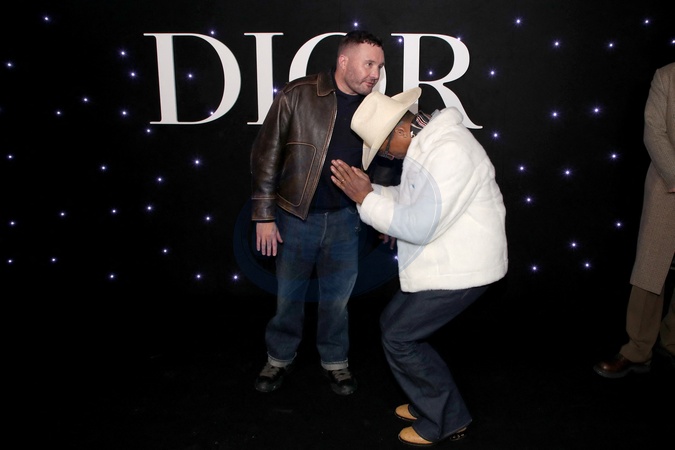 Pharrell Williams se met à genoux pour saluer son «Maître» Kim Jones après le Défilé Dior Collection Homme Prêt-à-Porter Automne/Hiver 2024-2025 lors de la Fashion Week de Paris (PFW), à l'École Miliatire, Place Fontenoy, à Paris, France, le 19 janvier 2024. © Bertrand Rindoff/Bestimage Celebs attend the Dior Men's Fashion Show, Fall-Winter 2024/2025 Collection as part of Paris Fashion Week, France, on January 19, 2024.