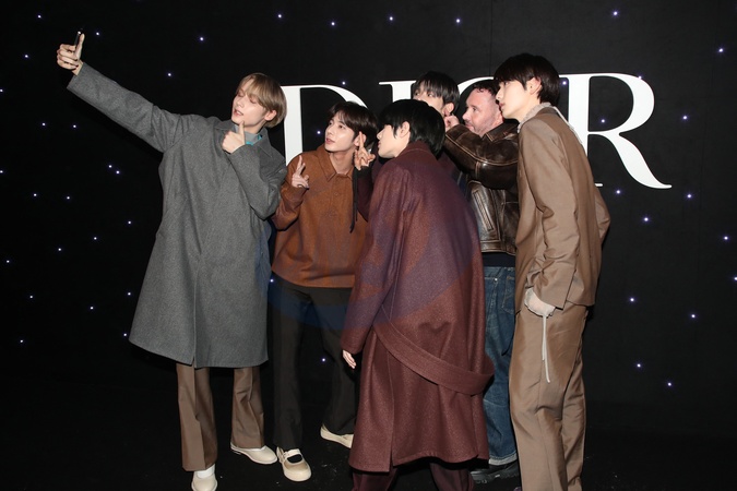 Kim Jones pose avec Soobin, HueningKai, Yeonjun, Beomgyu, Taehyun du Boys band Sud Coréen «TOMORROW X TOGETHER» après le Défilé Dior Collection Homme Prêt-à-Porter Automne/Hiver 2024-2025 lors de la Fashion Week de Paris (PFW), à l'École Miliatire, Place Fontenoy, à Paris, France, le 19 janvier 2024. © Bertrand Rindoff/Bestimage Celebs attend the Dior Men's Fashion Show, Fall-Winter 2024/2025 Collection as part of Paris Fashion Week, France, on January 19, 2024.
