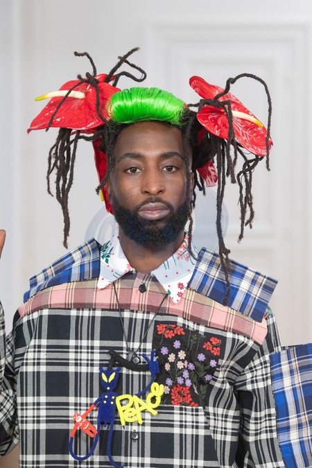 Walter Van Beirendonck Model On Catwalk, Men, Paris Fashion Week 2024 Man Ready To Wear For Fall Winter, Defile, Fashion Show Runway Collection, Pret A Porter, Modelwear, Modeschau, Man, Laufsteg Herbst France CloseUp accessories details catwalk fashion outlook beauty runway men parisPARMFW24, Credit:www.fashionpps.com / Avalon