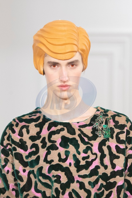 Walter Van Beirendonck Model On Catwalk, Men, Paris Fashion Week 2024 Man Ready To Wear For Fall Winter, Defile, Fashion Show Runway Collection, Pret A Porter, Modelwear, Modeschau, Man, Laufsteg Herbst France CloseUp accessories details catwalk fashion outlook beauty runway men parisPARMFW24, Credit:www.fashionpps.com / Avalon