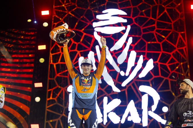 EBSTER Tobias (aut), Kini Rally Racing Team, KTM, Moto, Originals by Motul, FIM W2RC, portrait during the Final Podium of the Dakar 2024 on January 19, 2024 in Yanbu, Saudi Arabia. © DPPI/Panoramic/Bestimage