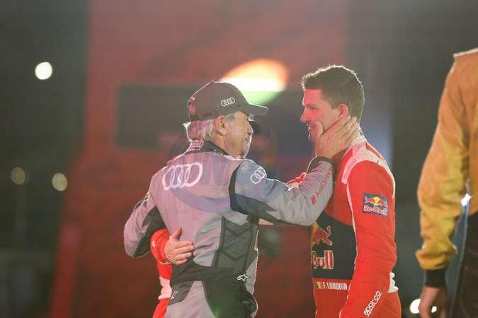 SAINZ Carlos (spa), Team Audi Sport, Audi RS Q E-Tron E2, FIA Ultimate, FIA W2RC, LURQUIN Fabian (bel), Bahrain Raid Xtreme, Prodrive Hunter, FIA Ultimate, portrait during the Final Podium of the Dakar 2024 on January 19, 2024 in Yanbu, Saudi Arabia. © DPPI/Panoramic/Bestimage