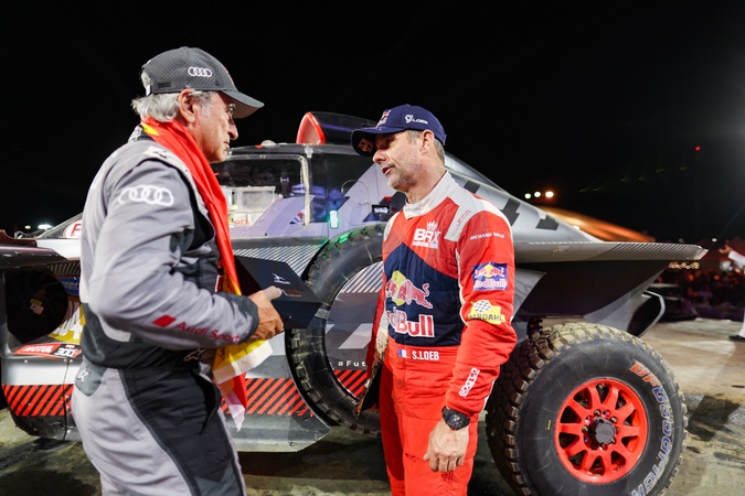 SAINZ Carlos (spa), Team Audi Sport, Audi RS Q E-Tron E2, FIA Ultimate, FIA W2RC, LOEB Sébastien (fra), Bahrain Raid Xtreme, Prodrive Hunter, FIA Ultimate, portrait during the Final Podium of the Dakar 2024 on January 19, 2024 in Yanbu, Saudi Arabia. © DPPI/Panoramic/Bestimage