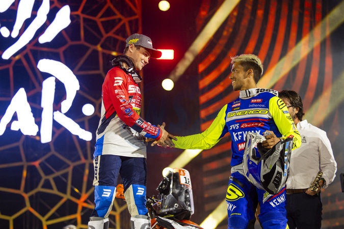 COX Bradley (zaf), BAS World KTM Racing Team, KTM, Moto, FIM W2RC, KOITHA VEETTIL Harith Noah (ind), Sherco Factory, Sherco, Motul, Moto, FIM W2RC, portrait during the Final Podium of the Dakar 2024 on January 19, 2024 in Yanbu, Saudi Arabia. © DPPI/Panoramic/Bestimage