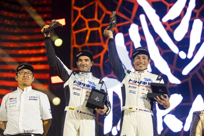 500 MIURA Akira (jpn), BARBET Mayeul (fra), Toyota Auto Body, Toyota Land Cruiser GR Sport, Motul, FIA Stock, portrait during the Final Podium of the Dakar 2024 on January 19, 2024 in Yanbu, Saudi Arabia. © DPPI/Panoramic/Bestimage