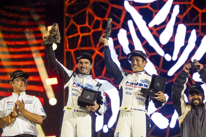 500 MIURA Akira (jpn), BARBET Mayeul (fra), Toyota Auto Body, Toyota Land Cruiser GR Sport, Motul, FIA Stock, portrait during the Final Podium of the Dakar 2024 on January 19, 2024 in Yanbu, Saudi Arabia. © DPPI/Panoramic/Bestimage