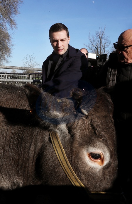 Le président du Rassemblement National (RN), Jordan Bardella visite une ferme agricole et un élevage bovin avant de tenir sur l'exploitation une réunion publique sur le malaise paysan, à Queyrac dans le Medoc en Gironde, France, le 20 Janvier 2024. © Patrick Bernard/Bestimage President of the French far-right party ‘Rassemblement National' (RN) Jordan Bardella during a visit to a farm where he spoke to farmers in Queyrac, France on January 20, 2024.