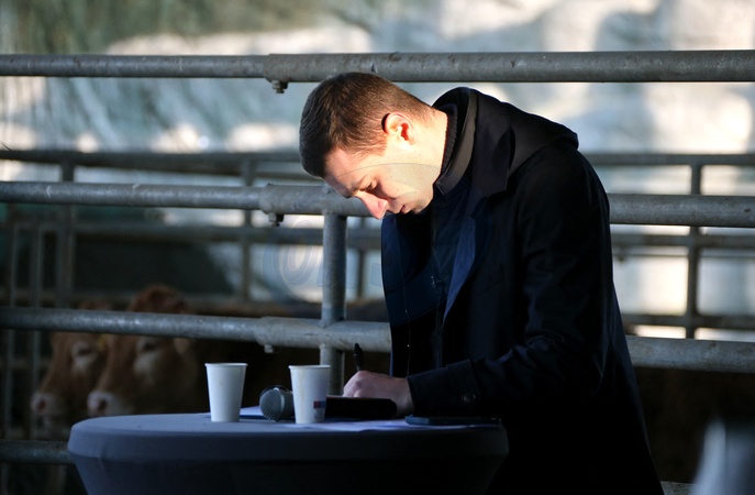 Le président du Rassemblement National (RN), Jordan Bardella visite une ferme agricole et un élevage bovin avant de tenir sur l'exploitation une réunion publique sur le malaise paysan, à Queyrac dans le Medoc en Gironde, France, le 20 Janvier 2024. © Patrick Bernard/Bestimage President of the French far-right party ‘Rassemblement National' (RN) Jordan Bardella during a visit to a farm where he spoke to farmers in Queyrac, France on January 20, 2024.