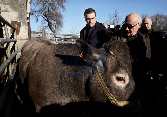 Le président du Rassemblement National (RN), Jordan Bardella visite une ferme agricole et un élevage bovin avant de tenir sur l'exploitation une réunion publique sur le malaise paysan, à Queyrac dans le Medoc en Gironde, France, le 20 Janvier 2024. © Patrick Bernard/Bestimage President of the French far-right party ‘Rassemblement National' (RN) Jordan Bardella during a visit to a farm where he spoke to farmers in Queyrac, France on January 20, 2024.