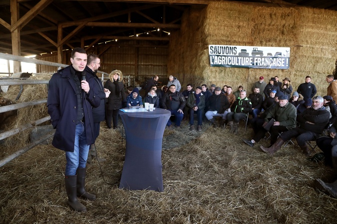 Le président du Rassemblement National (RN), Jordan Bardella visite une ferme agricole et un élevage bovin avant de tenir sur l'exploitation une réunion publique sur le malaise paysan, à Queyrac dans le Medoc en Gironde, France, le 20 Janvier 2024. © Patrick Bernard/Bestimage President of the French far-right party ‘Rassemblement National' (RN) Jordan Bardella during a visit to a farm where he spoke to farmers in Queyrac, France on January 20, 2024.
