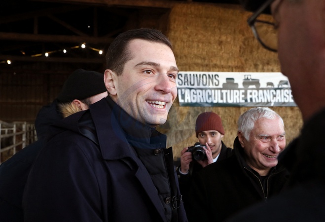 Le président du Rassemblement National (RN), Jordan Bardella visite une ferme agricole et un élevage bovin avant de tenir sur l'exploitation une réunion publique sur le malaise paysan, à Queyrac dans le Medoc en Gironde, France, le 20 Janvier 2024. © Patrick Bernard/Bestimage President of the French far-right party ‘Rassemblement National' (RN) Jordan Bardella during a visit to a farm where he spoke to farmers in Queyrac, France on January 20, 2024.