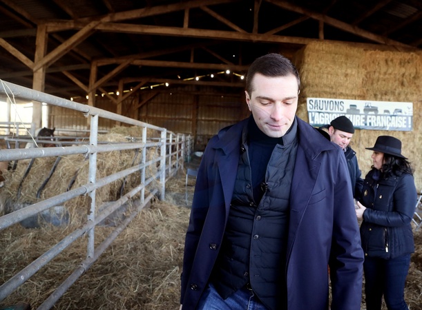 Le président du Rassemblement National (RN), Jordan Bardella visite une ferme agricole et un élevage bovin avant de tenir sur l'exploitation une réunion publique sur le malaise paysan, à Queyrac dans le Medoc en Gironde, France, le 20 Janvier 2024. © Patrick Bernard/Bestimage President of the French far-right party ‘Rassemblement National' (RN) Jordan Bardella during a visit to a farm where he spoke to farmers in Queyrac, France on January 20, 2024.