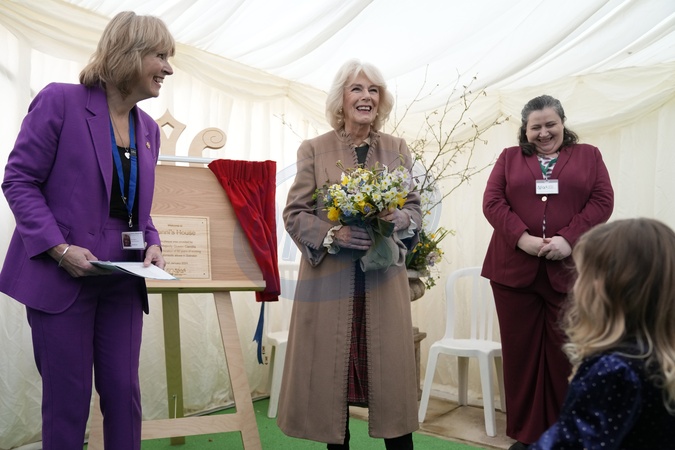 Britain's Queen Camilla smiles after unveiling a plaque during a visit to a women's refuge in Swindon, England, Monday, Jan. 22, 2024. To mark the 50th anniversary of the Swindon Domestic Abuse Support Service (SDASS), Her Majesty The Queen visited the charity's women's refuge, and met staff, volunteers, families and partner agencies., Credit:Alastair Grant / Avalon