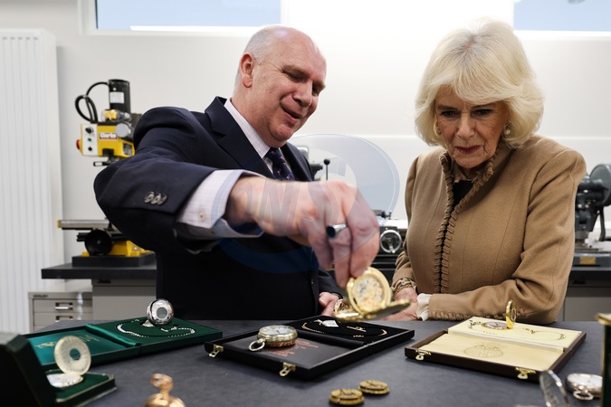 Britain's Queen Camilla (R) listens to Deacon & Son's manager director Richard Deacon, as he shows her a South Western Railway Station Masters Pocket Watch, during a visit to Deacon & Son Jewellers in Swindon, western England, on January 22, 2024, as the company celebrates 175 years of trading., Credit:ADRIAN DENNIS / Avalon