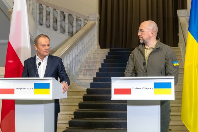 KYIV, UKRAINE - JANUARY 22, 2024 - Ukrainian Prime Minister Denys Shmyhal (R) and Polish Prime Minister Donald Tusk are pictured during a joint briefing, Kyiv, capital of Ukraine, Credit:Pavlo Bahmut / Avalon