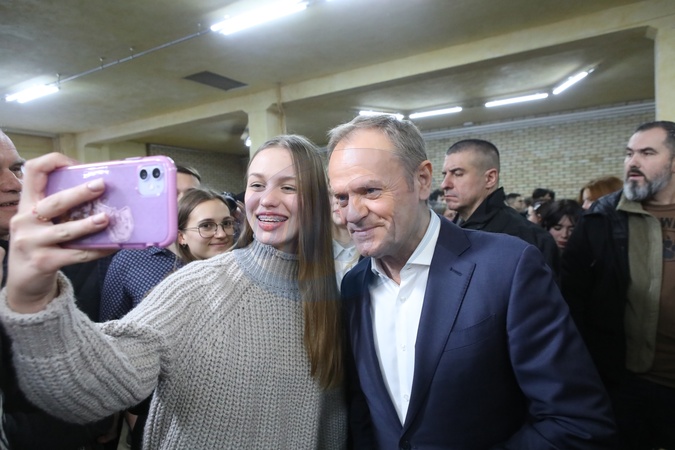 KYIV, UKRAINE - JANUARY 22, 2024 - A student takes a selfie with Prime Minister of Poland Donald Tusk during a meeting at the National University of Kyiv-Mohyla Academy, Kyiv, capital of Ukraine, Credit:Volodymyr Tarasov / Avalon