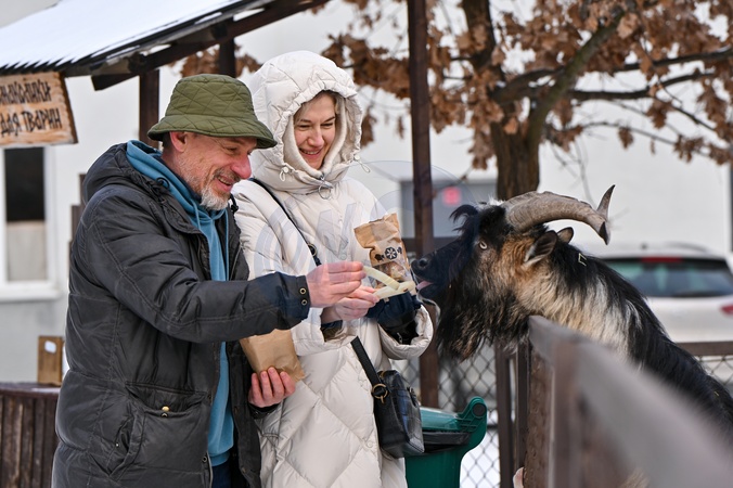 LVIV, UKRAINE - JANUARY 21, 2024 - People feed a goat in Shevchenkivskyi Hai (Shevchenko grove) on the territory of the Klymentii Sheptytskyi Museum of Folk Architecture and Rural Life, Lviv, western Ukraine., Credit:Anastasiia Smolienko / Avalon
