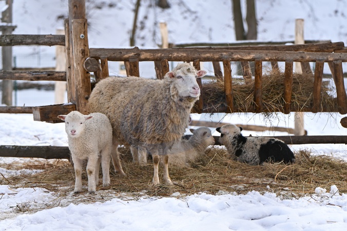 LVIV, UKRAINE - JANUARY 21, 2024 - Lambs and sheep live in Shevchenkivskyi Hai (Shevchenko grove) on the territory of the Klymentii Sheptytskyi Museum of Folk Architecture and Rural Life, Lviv, western Ukraine., Credit:Anastasiia Smolienko / Avalon