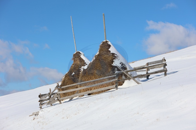 IVANO-FRANKIVSK REGION, UKRAINE - JANUARY 21, 2024 - Haystacks secured in place by unhewn sticks on a snow-covered slope in the village of Zamahora, Verkhovyna district, Ivano-Frankivsk region, western Ukraine., Credit:Yurii Rylchuk / Avalon