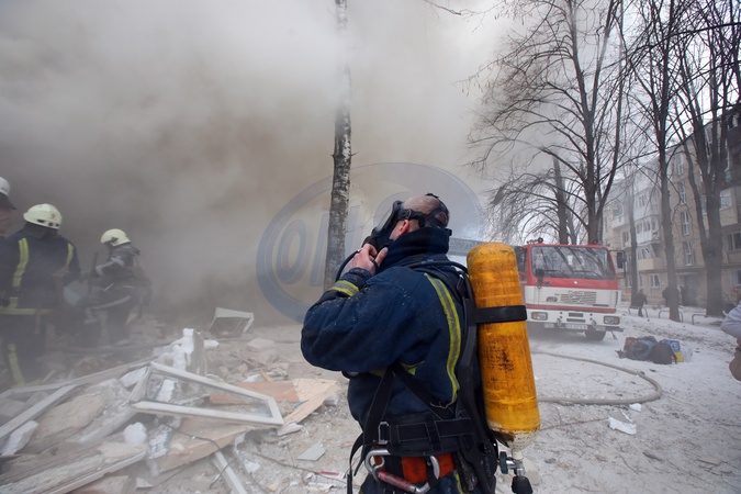 KHARKIV, UKRAINE - JANUARY 23, 2024 - A firefighter wears an SCBA as rescuers put out the fires after the Russian missile attack on Kharkiv, northeastern Ukraine. As reported, the Russian missile strike which took place Tuesday morning, January 23, has claimed the lives of seven people and has left 63 people injured in the northeastern Ukrainian city of Kharkiv., Credit:Vyacheslav Madiyevskyy / Avalon