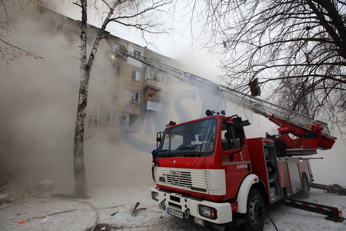 KHARKIV, UKRAINE - JANUARY 23, 2024 - Firefighters use an aerial work platform to reach an apartment as they put out the fires after the Russian missile attack on Kharkiv, northeastern Ukraine. As reported, the Russian missile strike which took place Tuesday morning, January 23, has claimed the lives of seven people and has left 63 people injured in the northeastern Ukrainian city of Kharkiv., Credit:Vyacheslav Madiyevskyy / Avalon