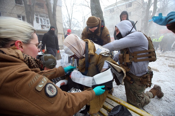 KHARKIV, UKRAINE - JANUARY 23, 2024 - First responders administer first aid on an injured man after the Russian missile attack on Kharkiv, northeastern Ukraine. As reported, the Russian missile strike which took place Tuesday morning, January 23, has claimed the lives of seven people and has left 63 people injured in the northeastern Ukrainian city of Kharkiv., Credit:Vyacheslav Madiyevskyy / Avalon