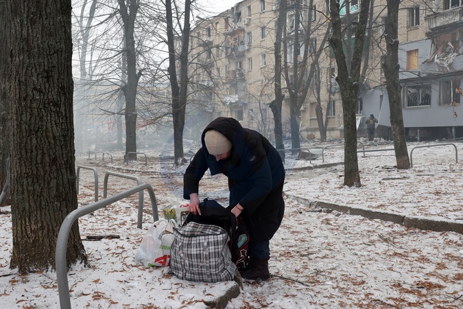 KHARKIV, UKRAINE - JANUARY 23, 2024 - A woman puts salvaged belongings into a bag outside a residential building damaged in the Russian missile attack on Kharkiv, northeastern Ukraine. As reported, the Russian missile strike which took place Tuesday morning, January 23, has claimed the lives of seven people and has left 63 people injured in the northeastern Ukrainian city of Kharkiv., Credit:Vyacheslav Madiyevskyy / Avalon