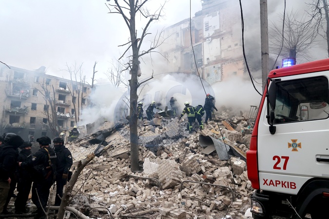 KHARKIV, UKRAINE - JANUARY 23, 2024 - Rescuers search for people under the rubble at a residential building damaged in the Russian missile attack on Kharkiv, northeastern Ukraine. As reported, the Russian missile strike which took place Tuesday morning, January 23, has claimed the lives of seven people and has left 63 people injured in the northeastern Ukrainian city of Kharkiv., Credit:Vyacheslav Madiyevskyy / Avalon