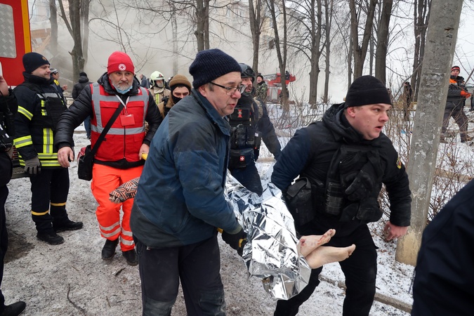 KHARKIV, UKRAINE - JANUARY 23, 2024 - First responders carry an injured woman on the stretcher after the Russian missile attack on Kharkiv, northeastern Ukraine. As reported, the Russian missile strike which took place Tuesday morning, January 23, has claimed the lives of seven people and has left 63 people injured in the northeastern Ukrainian city of Kharkiv., Credit:Vyacheslav Madiyevskyy / Avalon