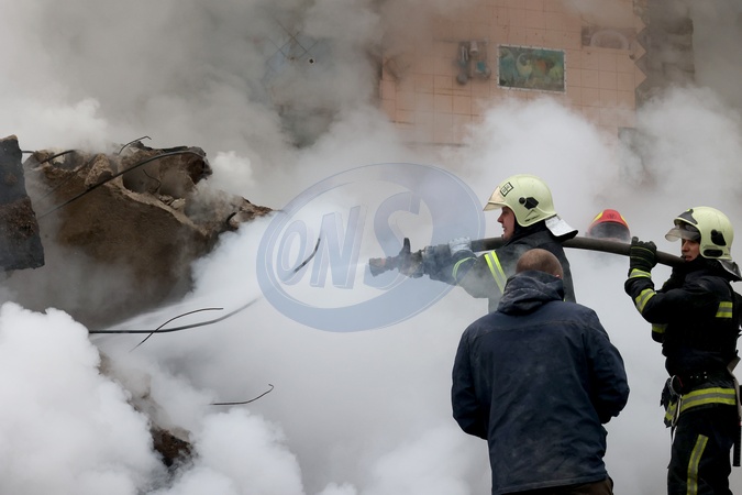 KHARKIV, UKRAINE - JANUARY 23, 2024 - Firefighters put out a fire after the Russian missile attack on Kharkiv, northeastern Ukraine. As reported, the Russian missile strike which took place Tuesday morning, January 23, has claimed the lives of seven people and has left 63 people injured in the northeastern Ukrainian city of Kharkiv., Credit:Vyacheslav Madiyevskyy / Avalon