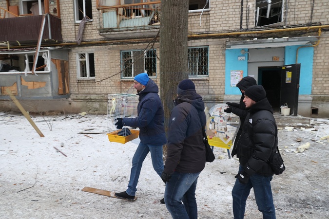 KHARKIV, UKRAINE - JANUARY 23, 2024 - Men carry bird cages salvaged from a residential building damaged in the Russian missile attack on Kharkiv, northeastern Ukraine. As reported, the Russian missile strike which took place Tuesday morning, January 23, has claimed the lives of seven people and has left 63 people injured in the northeastern Ukrainian city of Kharkiv., Credit:Vyacheslav Madiyevskyy / Avalon
