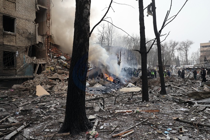 KHARKIV, UKRAINE - JANUARY 23, 2024 - The fire rages on the ruins as police officers stand by after the Russian missile attack on Kharkiv, northeastern Ukraine. As reported, the Russian missile strike which took place Tuesday morning, January 23, has claimed the lives of seven people and has left 63 people injured in the northeastern Ukrainian city of Kharkiv., Credit:Vyacheslav Madiyevskyy / Avalon