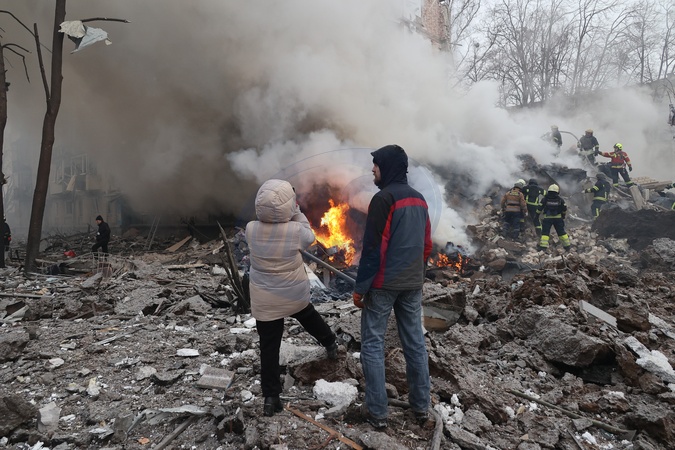 KHARKIV, UKRAINE - JANUARY 23, 2024 - A man and a woman watch the progress of a search and rescue effort at an apartment building ruined in the Russian missile attack on Kharkiv, northeastern Ukraine. As reported, the Russian missile strike which took place Tuesday morning, January 23, has claimed the lives of seven people and has left 63 people injured in the northeastern Ukrainian city of Kharkiv., Credit:Vyacheslav Madiyevskyy / Avalon