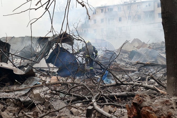 KHARKIV, UKRAINE - JANUARY 23, 2024 - A rescuer treads on the rubble during a search and rescue effort at a residential building damaged in the Russian missile attack on Kharkiv, northeastern Ukraine. As reported, the Russian missile strike which took place Tuesday morning, January 23, has claimed the lives of seven people and has left 63 people injured in the northeastern Ukrainian city of Kharkiv., Credit:Vyacheslav Madiyevskyy / Avalon