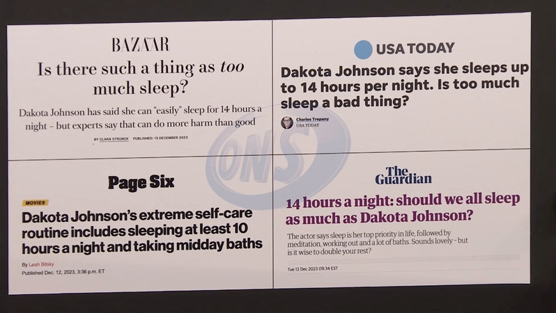 Pictures MUST credit: NBC Movie star Dakota Johnson has defended her ability to sleep up to 14 hours. The 34-year-old Fifty Shades of Grey actress hit out when she appeared on the Jimmy Fallon US talk show to promote forthcoming Marvel movie Madam Webb. She looked stunning in black mini dress and matching stilettos. Jimmy ,49, told her:” You made headlines recently.” He then held up a headline from the Wall Street Journal newspaper which read:"Dakota Johnson likes to sleep for 14 hours a night.” He then showed her follow up articles based on the claim from other publications around the world. He said to her: "That's a long time to sleep.' Laughing, she replied: "I didn't even say that like that. "I said that I could easily sleep 14 hours, but I don't, like, demand it. "I'm not a monster !” Picture supplied by JLPPA