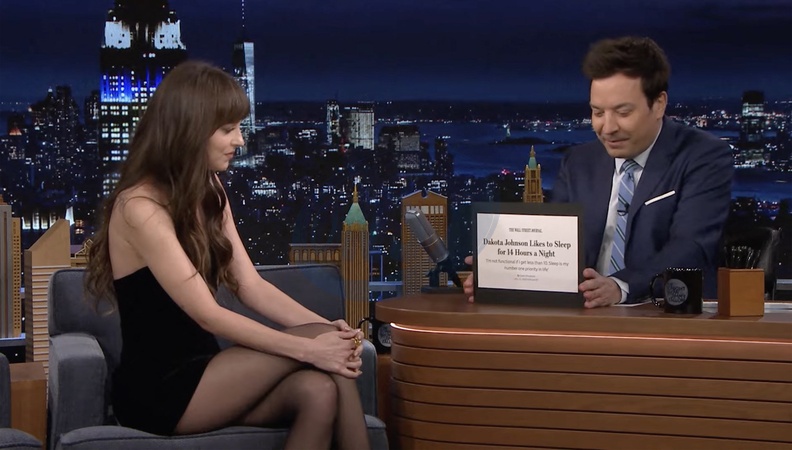 Pictures MUST credit: NBC Movie star Dakota Johnson has defended her ability to sleep up to 14 hours. The 34-year-old Fifty Shades of Grey actress hit out when she appeared on the Jimmy Fallon US talk show to promote forthcoming Marvel movie Madam Webb. She looked stunning in black mini dress and matching stilettos. Jimmy ,49, told her:” You made headlines recently.” He then held up a headline from the Wall Street Journal newspaper which read:"Dakota Johnson likes to sleep for 14 hours a night.” He then showed her follow up articles based on the claim from other publications around the world. He said to her: "That's a long time to sleep.' Laughing, she replied: "I didn't even say that like that. "I said that I could easily sleep 14 hours, but I don't, like, demand it. "I'm not a monster !” Picture supplied by JLPPA