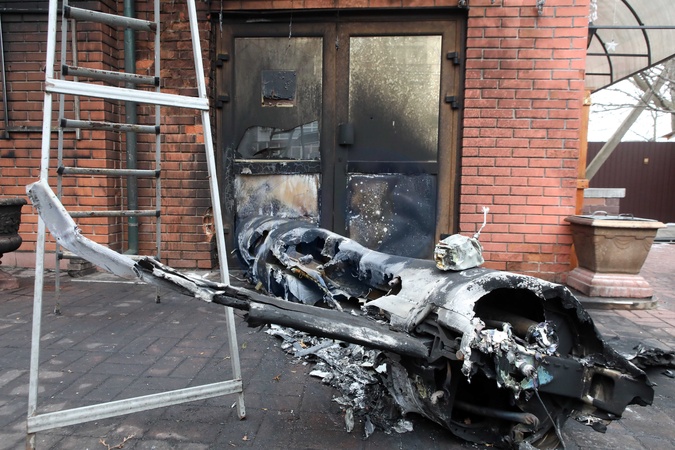 KRIUKIVSHCHYNA, UKRAINE - JANUARY 23, 2024 - A fragment of a downed Russian missile is seen on the ground outside a local cafe after the Russian missile attack on Ukraine that took place Tuesday morning, January 23, Kriukivshchyna, Kyiv region, northern Ukraine., Credit:Volodymyr Tarasov / Avalon