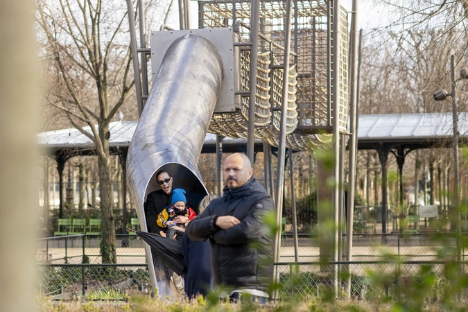 Exclusif - Prix Spécial - No web - Karlie Kloss et son fils Levi jouent au Jardin des Tuileries à Paris en compagnie de Gwyneth Paltrow en marge de la fashion week Haute Couture printemps/été 2024 (PFW) le 22 janvier 2024. Exclusive - No web en Suisse / Belgique Please pixelate child face prior to publication Karlie Kloss and her son play in the Jardin des Tuileries in Paris with Gwyneth Paltrow during the Haute Couture Spring/Summer 2024 (PFW) fashion week on January 22, 2024.