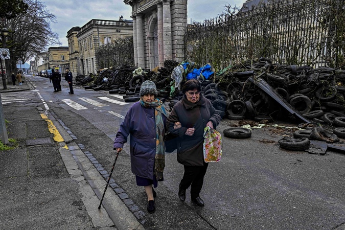 Des passants devant la préfecture du Lot et Garonne à Agen. - Manifestation des Agriculteurs du Lot-et-Garonne contre la politique fiscale et la baisse des revenusd, devant le préfecture d'Agen, France, le 24 janvier 2024. © Thierry Breton/Panoramic/Bestimage Farmers block front of the prefecture with tires and trash as they gather to protest against taxation policy and declining income in Agen, France on January 23, 2024.