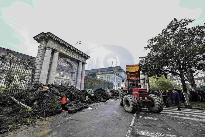 Les Agriculteurs deversent du fumier devant la préfecture à Agen - Manifestation des Agriculteurs du Lot-et-Garonne contre la politique fiscale et la baisse des revenusd, devant le préfecture d'Agen, France, le 24 janvier 2024. © Thierry Breton/Panoramic/Bestimage Farmers block front of the prefecture with tires and trash as they gather to protest against taxation policy and declining income in Agen, France on January 23, 2024.
