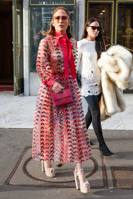 Jennifer Lopez (JLo) à la sortie du restaurant Gigi pour se rendre au défilé Valentino en marge de la Fashion Week de Paris (PFW)