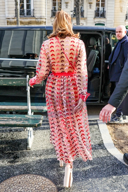 Jennifer Lopez (JLo) à la sortie du restaurant Gigi pour se rendre au défilé Valentino en marge de la Fashion Week de Paris (PFW)