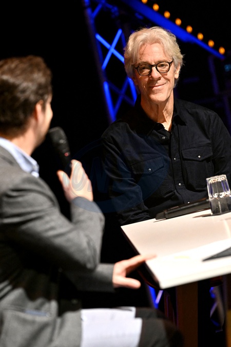 Exclusif - Stewart Copeland, musicien, batteur et fondateur du groupe The Police, parrain du MIDEM+24, a participé à une masterclass avec les étudiants du campus Georges-Méliès à Cannes, le 24 janvier 2024. Après avoir visité les infrastructures de ce campus qui propose de nombreuses formations dédiés aux écritures créatives et aux métiers de l'image, de niveau Bac à Bac+8, en programme court, long ou en formation continue, il a fait un arrêt sur la plateau tv des "Pitchouns" avant de rejoindre l'amphithéâtre et répondre aux questions d'Albin Lewi, le directeur artistique du festival CANNESERIES. Pendant plus d'une heure, il a parlé musique, intelligence artificielle mais il a surtout abordé son travail comme compositeur de musique de film. © Bruno Bebert / Bestimage Exclusive - For Germany Call for price - Stewart Copeland, from the Police group, in masterclass with the students of the Georges-Méliès campus in Cannes, during the MIDEM+24. On January 24th 2024