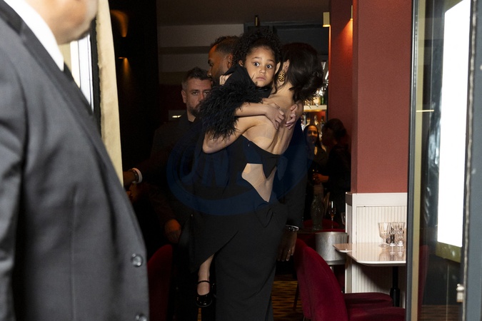 Exclusif - Kylie Jenner quitte le restaurant Giusé Trattoria avec sa fille Stormi ou elle a dîné avec sa mère et son compagnon à Paris le 24 janvier 2024. Merci de flouter le visage des enfants avant publication Exclusive - For Germany call for price - Kylie Jenner leaves the Giusé Trattoria restaurant with her daughter Stormi where she dined with her mother and her partner in Paris on January 24, 2024.