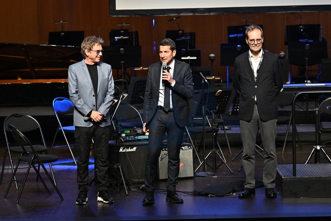Jean Michel Jarre, David Lisnard et Benoît Désveaux durant la soirée d'ouverture du MIDEM+24, salle Debussy au Palais des Festivals à Cannes, le 24 janvier 2024. D.Lisnard, le maire de Cannes, entouré de J.M.Jarre et B.Désveaux, le directeur général du groupe Hopscotch, ont lancé cette soirée avant que les parrains S.Copeland et Y.Alade déclarent officiellement le MIDEM+24 ouvert. C'est l'orchestre national de Cannes dirigé par P.A.Valade avec à la flute F.Bontron et Y.Deutsch à la guitare qui a débuté les concerts qui vont se succéder jusqu'au 27 janvier. Le MIDƐM+ est le rendez-vous incontournable de l'industrie musicale, dans sa nouvelle formule initiée par la ville de Cannes et le Palais des Festivals et des Congrès, rassemble toute la profession. Ce salon est aussi une grande fête pour le grand public avec des concerts, des DJ sets et des show cases. © Bruno Bebert / Bestimage MIDEM+24 opening night at the Palais des Festivals in Cannes. On January 24th 2024
