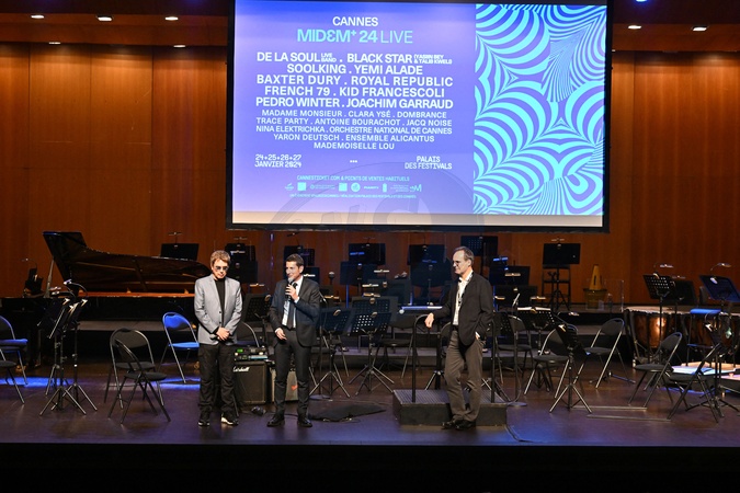 Jean Michel Jarre, David Lisnard et Benoît Désveaux durant la soirée d'ouverture du MIDEM+24, salle Debussy au Palais des Festivals à Cannes, le 24 janvier 2024. D.Lisnard, le maire de Cannes, entouré de J.M.Jarre et B.Désveaux, le directeur général du groupe Hopscotch, ont lancé cette soirée avant que les parrains S.Copeland et Y.Alade déclarent officiellement le MIDEM+24 ouvert. C'est l'orchestre national de Cannes dirigé par P.A.Valade avec à la flute F.Bontron et Y.Deutsch à la guitare qui a débuté les concerts qui vont se succéder jusqu'au 27 janvier. Le MIDƐM+ est le rendez-vous incontournable de l'industrie musicale, dans sa nouvelle formule initiée par la ville de Cannes et le Palais des Festivals et des Congrès, rassemble toute la profession. Ce salon est aussi une grande fête pour le grand public avec des concerts, des DJ sets et des show cases. © Bruno Bebert / Bestimage MIDEM+24 opening night at the Palais des Festivals in Cannes. On January 24th 2024