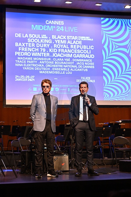 Jean Michel Jarre et David Lisnard durant la soirée d'ouverture du MIDEM+24, salle Debussy au Palais des Festivals à Cannes, le 24 janvier 2024. D.Lisnard, le maire de Cannes, entouré de J.M.Jarre et B.Désveaux, le directeur général du groupe Hopscotch, ont lancé cette soirée avant que les parrains S.Copeland et Y.Alade déclarent officiellement le MIDEM+24 ouvert. C'est l'orchestre national de Cannes dirigé par P.A.Valade avec à la flute F.Bontron et Y.Deutsch à la guitare qui a débuté les concerts qui vont se succéder jusqu'au 27 janvier. Le MIDƐM+ est le rendez-vous incontournable de l'industrie musicale, dans sa nouvelle formule initiée par la ville de Cannes et le Palais des Festivals et des Congrès, rassemble toute la profession. Ce salon est aussi une grande fête pour le grand public avec des concerts, des DJ sets et des show cases. © Bruno Bebert / Bestimage MIDEM+24 opening night at the Palais des Festivals in Cannes. On January 24th 2024