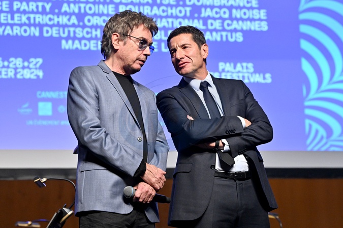 Jean Michel Jarre et David Lisnard durant la soirée d'ouverture du MIDEM+24, salle Debussy au Palais des Festivals à Cannes, le 24 janvier 2024. D.Lisnard, le maire de Cannes, entouré de J.M.Jarre et B.Désveaux, le directeur général du groupe Hopscotch, ont lancé cette soirée avant que les parrains S.Copeland et Y.Alade déclarent officiellement le MIDEM+24 ouvert. C'est l'orchestre national de Cannes dirigé par P.A.Valade avec à la flute F.Bontron et Y.Deutsch à la guitare qui a débuté les concerts qui vont se succéder jusqu'au 27 janvier. Le MIDƐM+ est le rendez-vous incontournable de l'industrie musicale, dans sa nouvelle formule initiée par la ville de Cannes et le Palais des Festivals et des Congrès, rassemble toute la profession. Ce salon est aussi une grande fête pour le grand public avec des concerts, des DJ sets et des show cases. © Bruno Bebert / Bestimage MIDEM+24 opening night at the Palais des Festivals in Cannes. On January 24th 2024