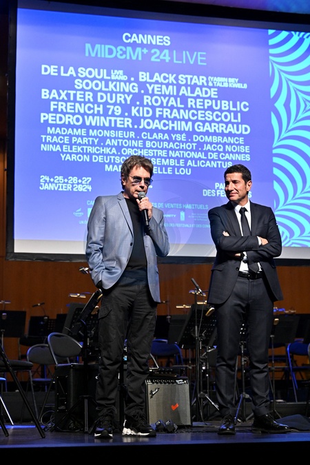 Jean Michel Jarre et David Lisnard durant la soirée d'ouverture du MIDEM+24, salle Debussy au Palais des Festivals à Cannes, le 24 janvier 2024. D.Lisnard, le maire de Cannes, entouré de J.M.Jarre et B.Désveaux, le directeur général du groupe Hopscotch, ont lancé cette soirée avant que les parrains S.Copeland et Y.Alade déclarent officiellement le MIDEM+24 ouvert. C'est l'orchestre national de Cannes dirigé par P.A.Valade avec à la flute F.Bontron et Y.Deutsch à la guitare qui a débuté les concerts qui vont se succéder jusqu'au 27 janvier. Le MIDƐM+ est le rendez-vous incontournable de l'industrie musicale, dans sa nouvelle formule initiée par la ville de Cannes et le Palais des Festivals et des Congrès, rassemble toute la profession. Ce salon est aussi une grande fête pour le grand public avec des concerts, des DJ sets et des show cases. © Bruno Bebert / Bestimage MIDEM+24 opening night at the Palais des Festivals in Cannes. On January 24th 2024