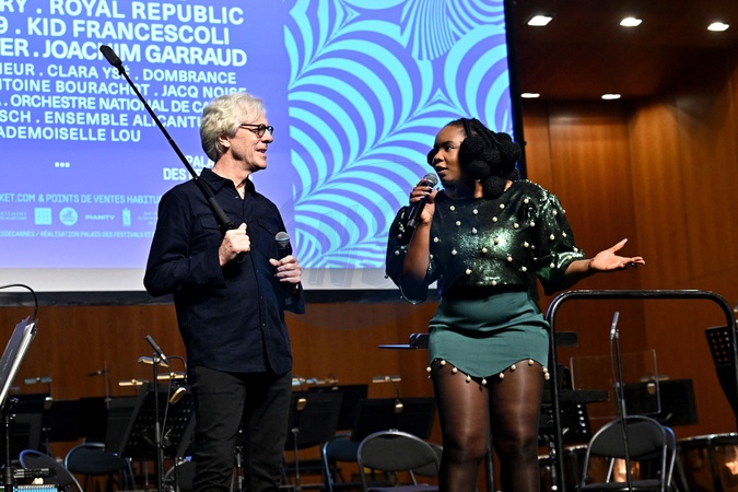 Stewart Copeland, musicien, batteur et fondateur du groupe The Police, et Yemi Alade durant la soirée d'ouverture du MIDEM+24, salle Debussy au Palais des Festivals à Cannes, le 24 janvier 2024. D.Lisnard, le maire de Cannes, entouré de J.M.Jarre et B.Désveaux, le directeur général du groupe Hopscotch, ont lancé cette soirée avant que les parrains S.Copeland et Y.Alade déclarent officiellement le MIDEM+24 ouvert. C'est l'orchestre national de Cannes dirigé par P.A.Valade avec à la flute F.Bontron et Y.Deutsch à la guitare qui a débuté les concerts qui vont se succéder jusqu'au 27 janvier. Le MIDƐM+ est le rendez-vous incontournable de l'industrie musicale, dans sa nouvelle formule initiée par la ville de Cannes et le Palais des Festivals et des Congrès, rassemble toute la profession. Ce salon est aussi une grande fête pour le grand public avec des concerts, des DJ sets et des show cases. © Bruno Bebert / Bestimage MIDEM+24 opening night at the Palais des Festivals in Cannes. On January 24th 2024
